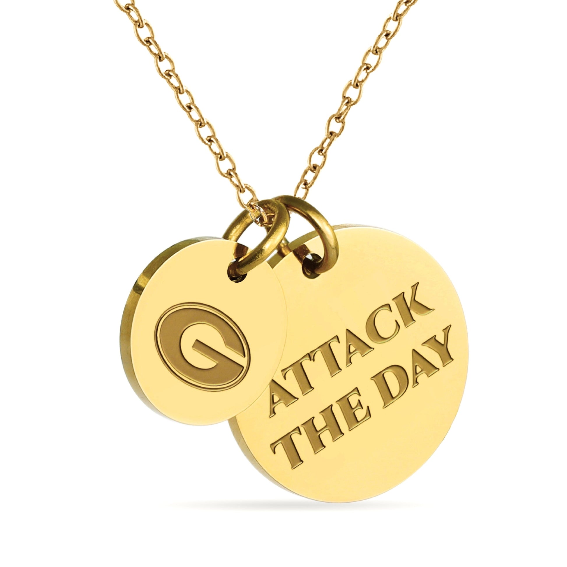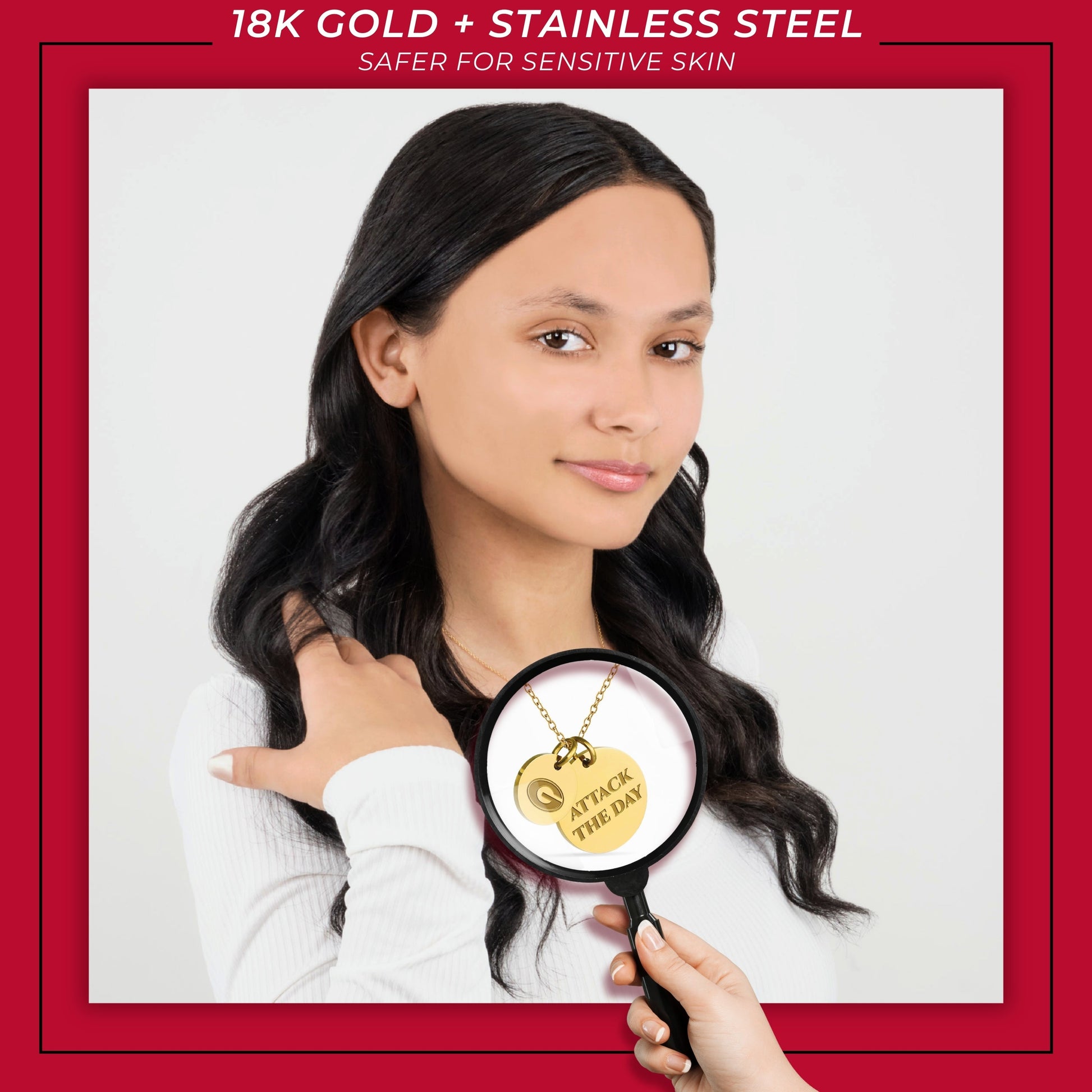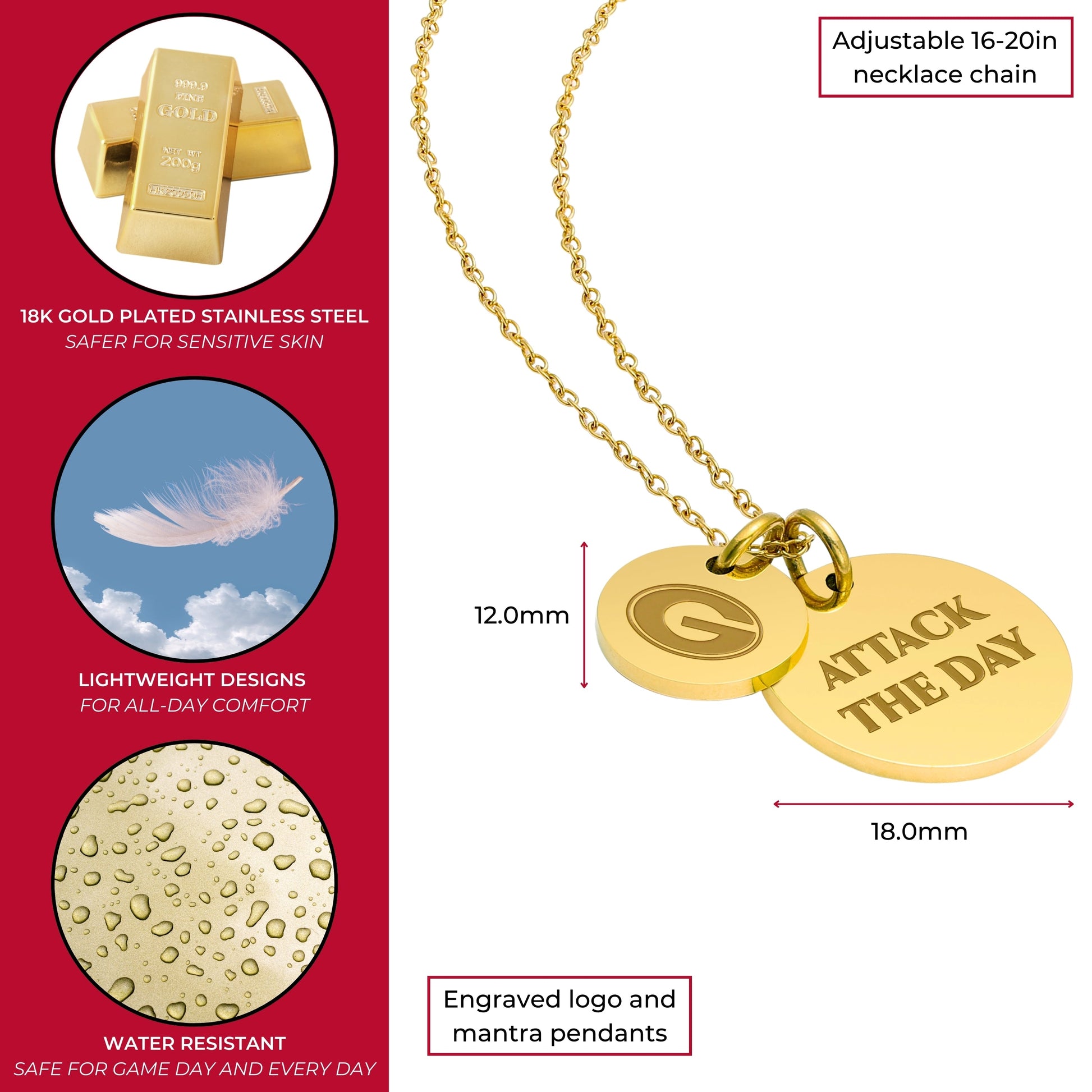 Proudly display your Georgia Bulldogs pride with this officially licensed Georgia necklace, featuring two gold-plated pendants engraved with the iconic Georgia G and the inspiring mantra, 'Attack the Day This pendant necklace, made from surgical-grade stainless steel and coated in 18K gold, offers both durability and elegance. Its adjustable length (16-20 inches) makes it perfect for everyday wear or Georgia game day. Whether you're attending a game or gifting it for a special occasion, this necklace is ideal for Georgia fans, students, and alumni. It makes a thoughtful present for birthdays, Mother’s Day, graduations, Christmas, any other celebration. Packaged simply yet beautifully, this necklace arrives ready for gifting, ensuring it will delight any Georgia fan