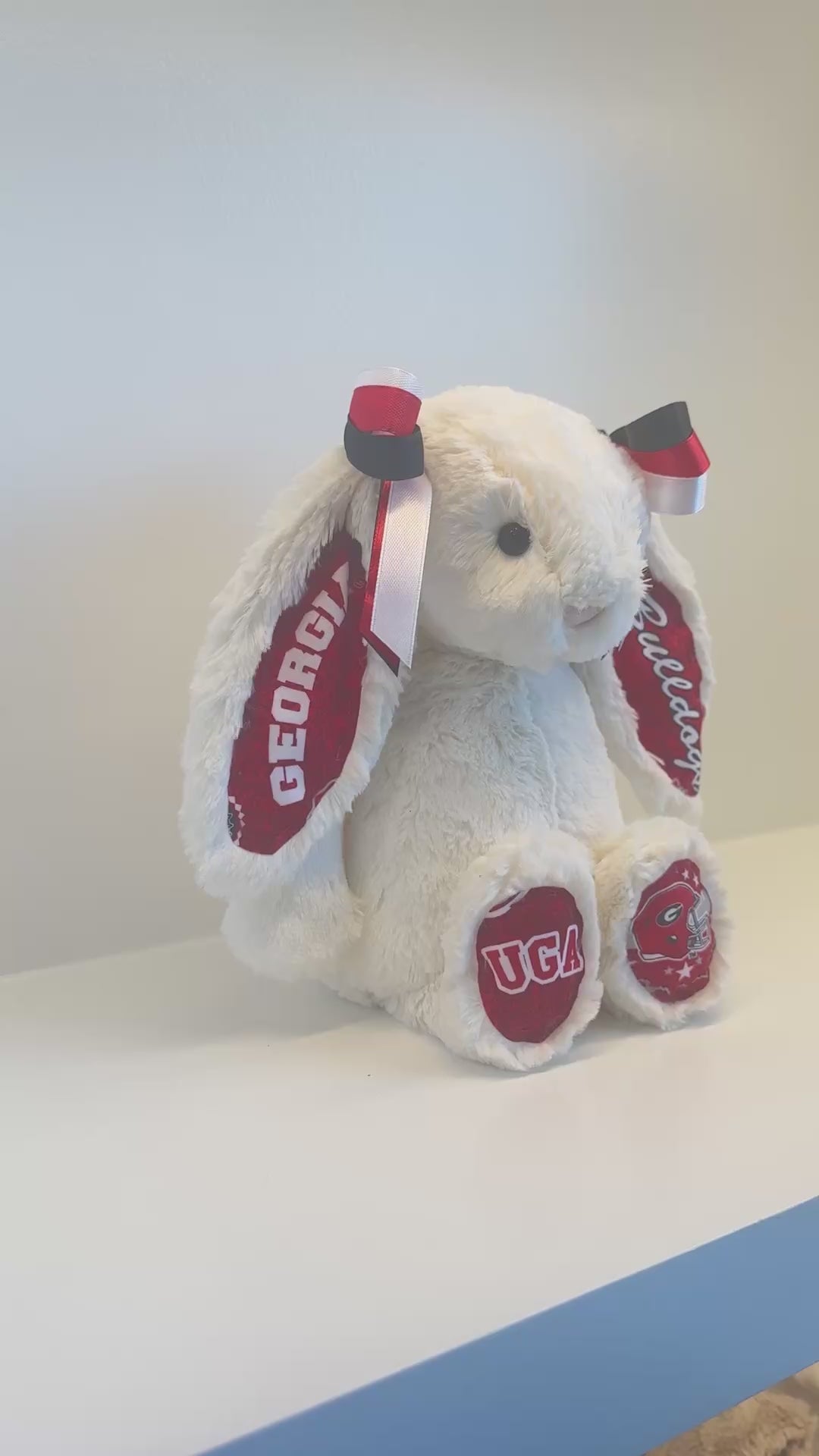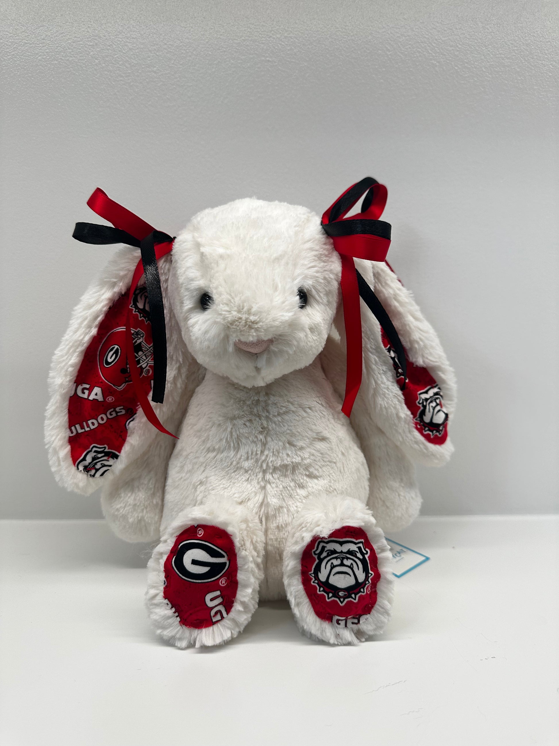 Snuggle up with this Custom College Jellycat Bashful Bunny. Each plush is adorned with custom licensed fabric for University of Georgia (UGA) featuring coordinated ears, feet, and matching bows that bring your university’s colors and spirit to life. This adorable plush makes the perfect gift for newly accepted students, homesick college kids, devoted fans, alumni, and anyone who wants a cozy reminder of campus life.