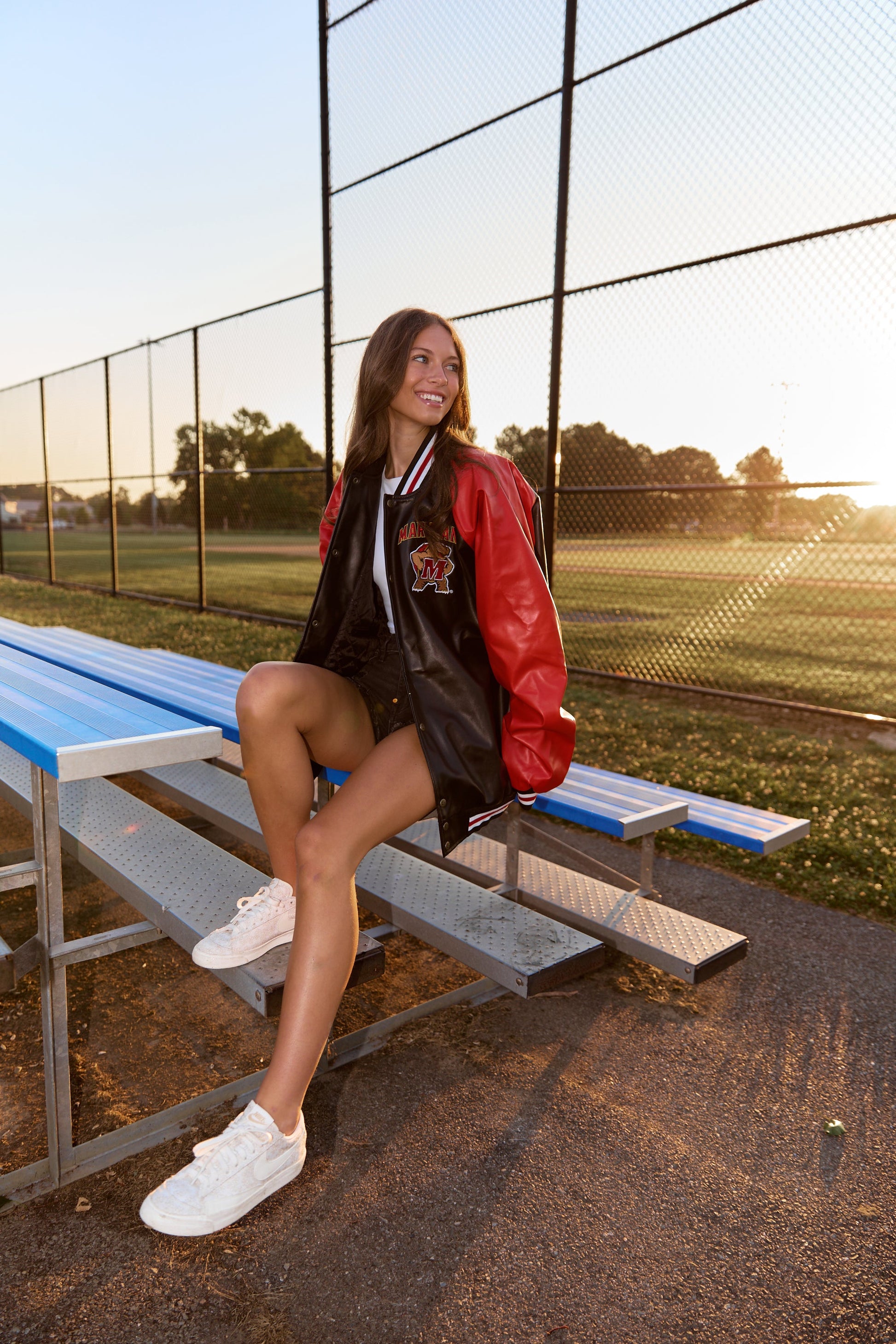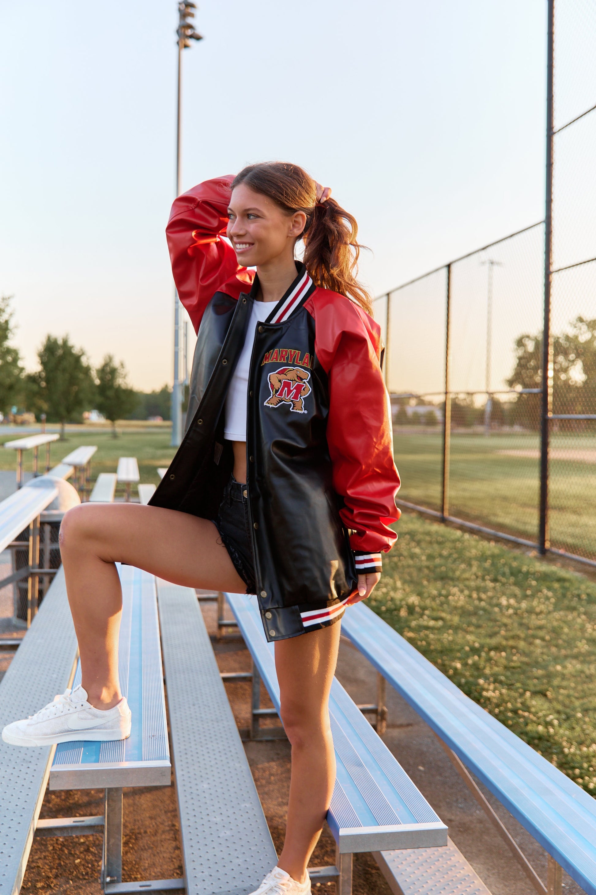ONE OF A KIND Maryland Unisex jacket - perfect gift for him or her! This iconic varsity letterman jacket with patches on the front and back is the perfect gift for him or her! Treat yourself to this luxurious vegan leather jacket that will be a closet staple for years to come.