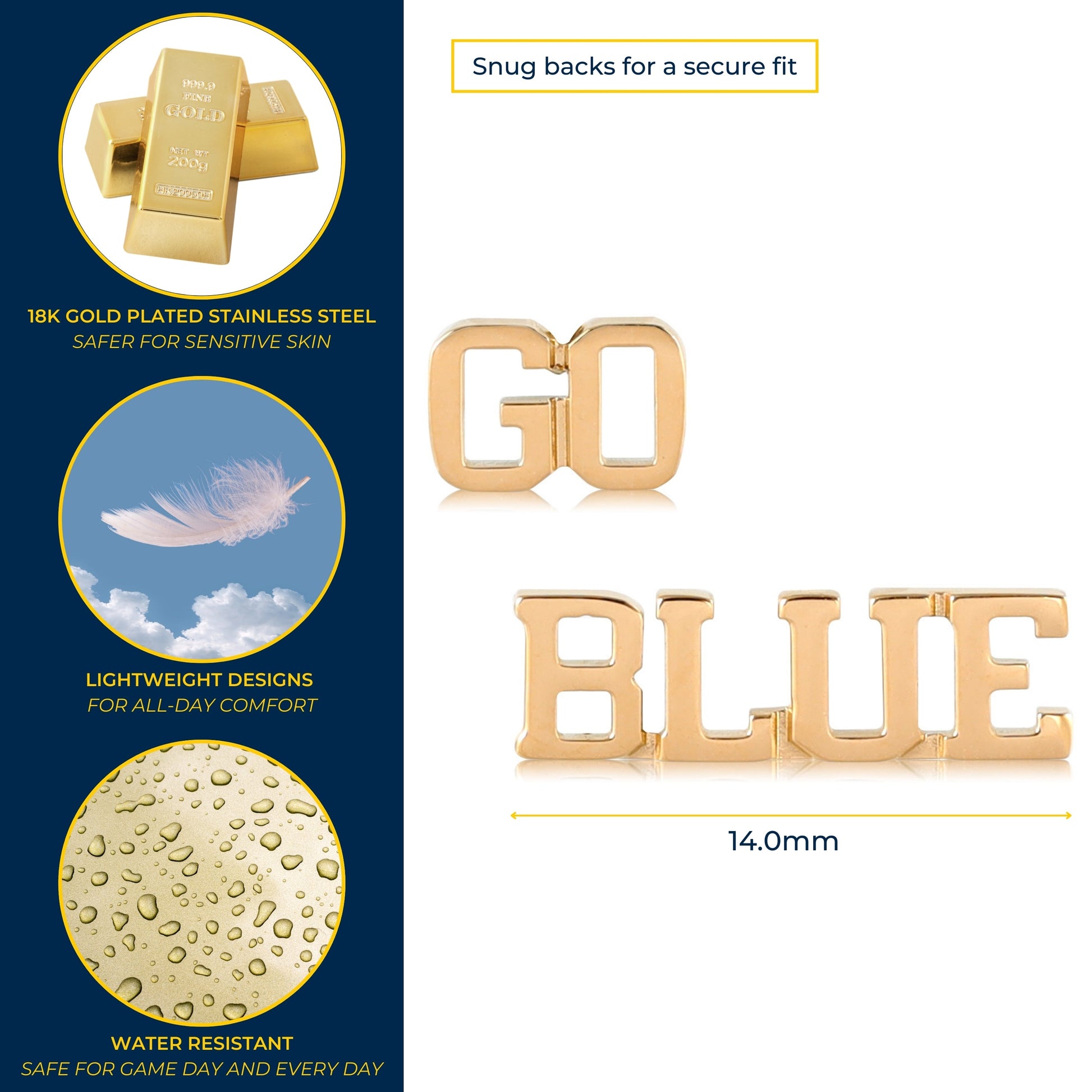 - 💛YOUR PERFECT FIT: These gold-plated stainless steel Michigan stud earrings are always the perfect fit. Add these classic Michigan earrings to show off your beloved Michigan Wolverines school and team. These UM earrings measure 6.36mm (GO), 14.00mm (BLUE) wide by 5.08mm tall.