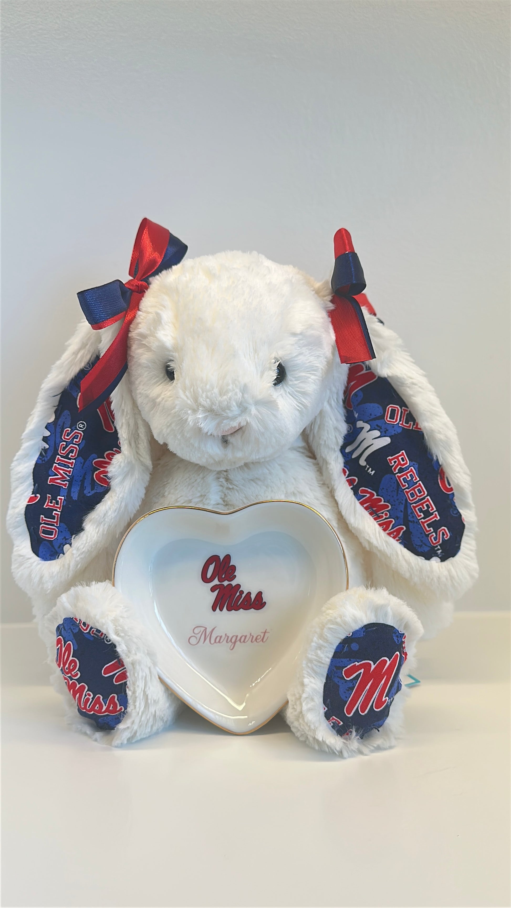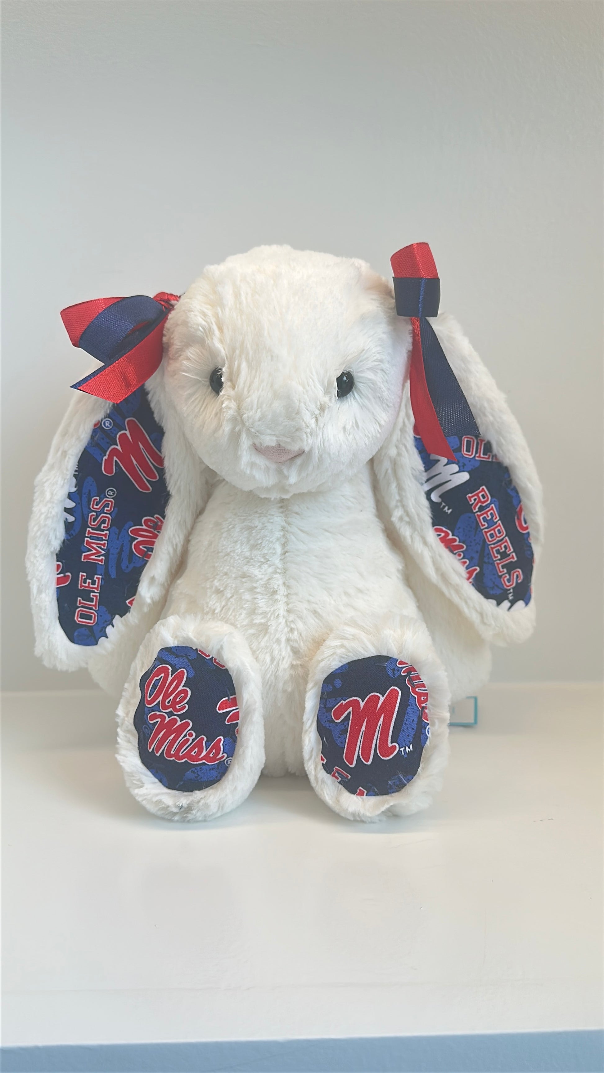 Snuggle up with this Custom College Jellycat Bashful Bunny. Each plush is adorned with University of Mississippi licensed fabric, featuring coordinated ears, feet, and matching bows that bring your university’s colors and spirit to life. This adorable plush makes the perfect gift for newly accepted students, homesick college kids, devoted fans, alumni, and anyone who wants a cozy reminder of campus life.