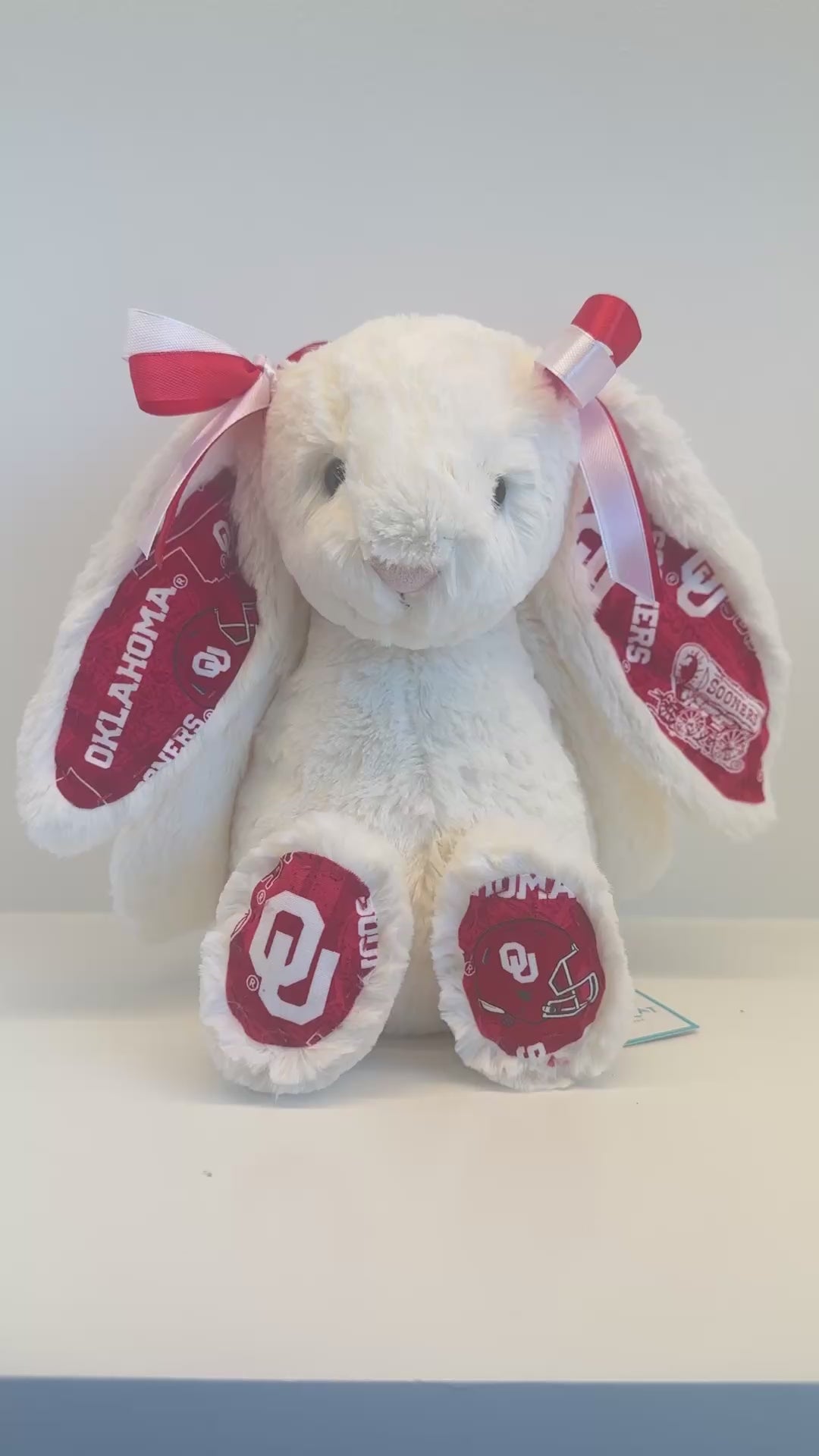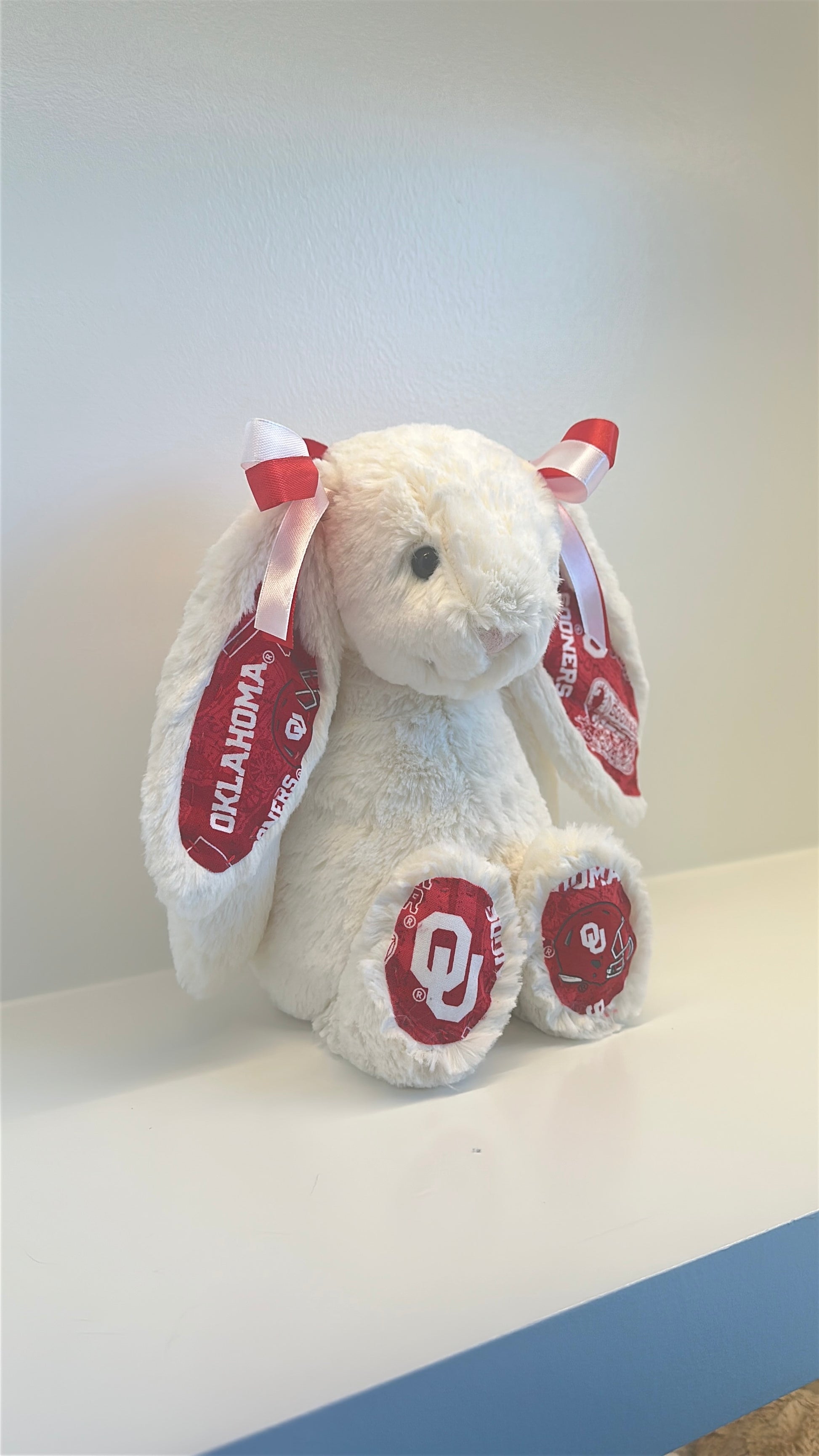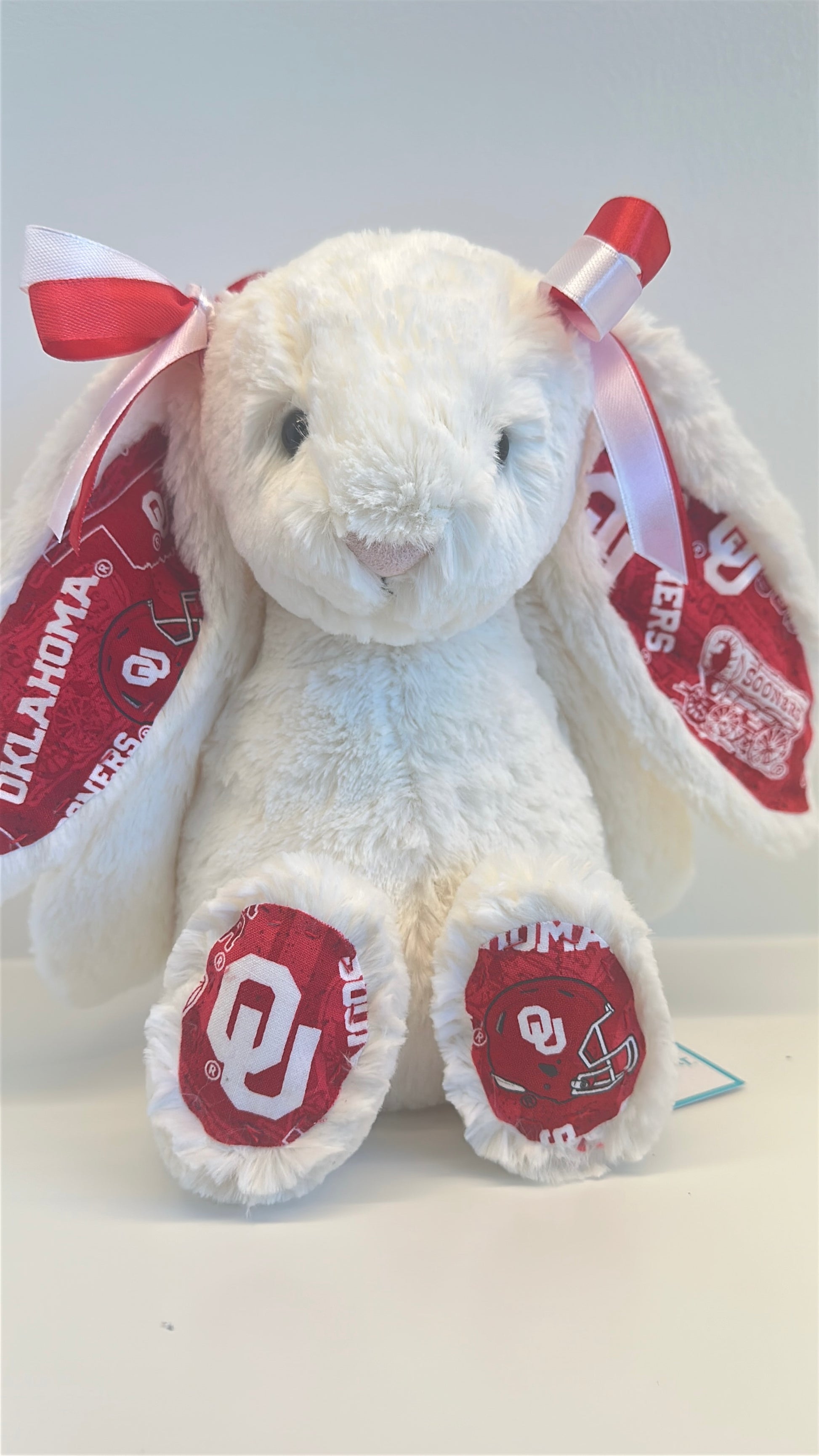 Snuggle up with this Custom College Jellycat Bashful Bunny. Each plush is adorned with custom licensed fabric for your Oklahoma University featuring coordinated ears, feet, and matching bows that bring your university’s colors and spirit to life. This adorable plush makes the perfect gift for newly accepted students, homesick college kids, devoted fans, alumni, and anyone who wants a cozy reminder of campus life.