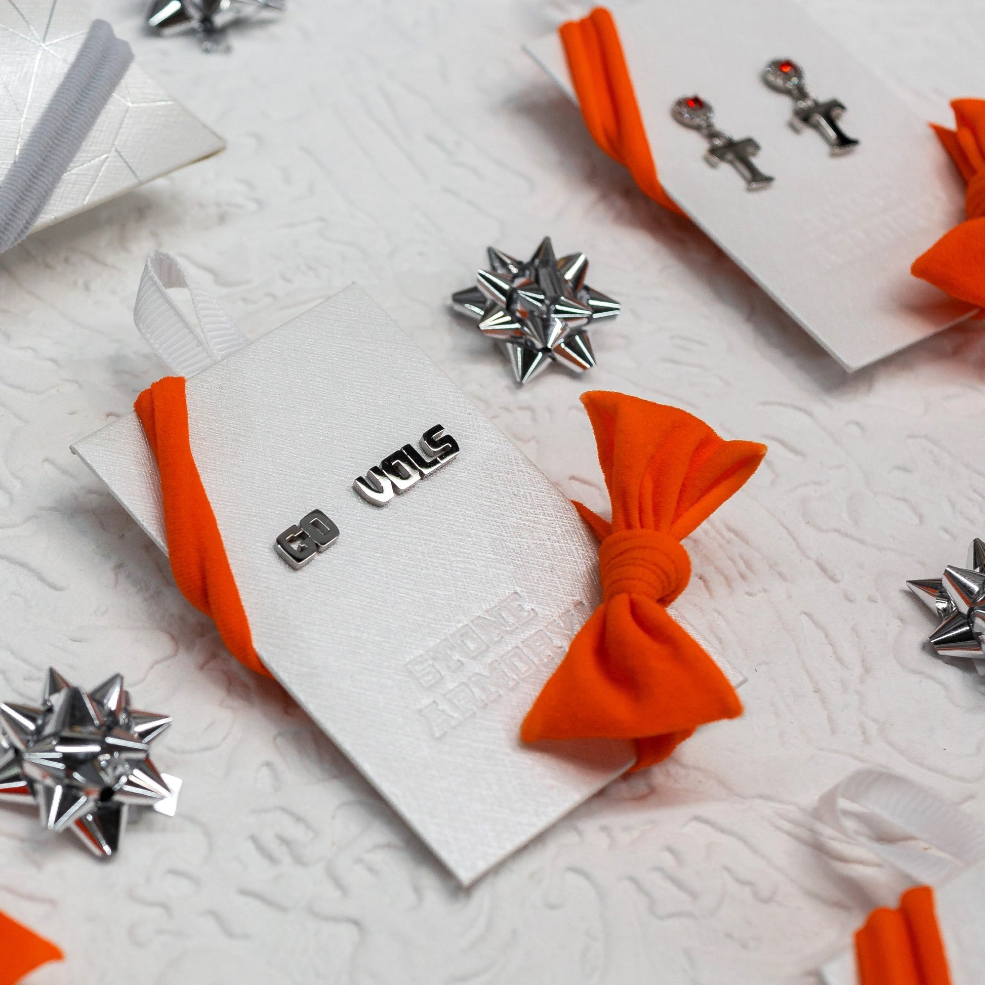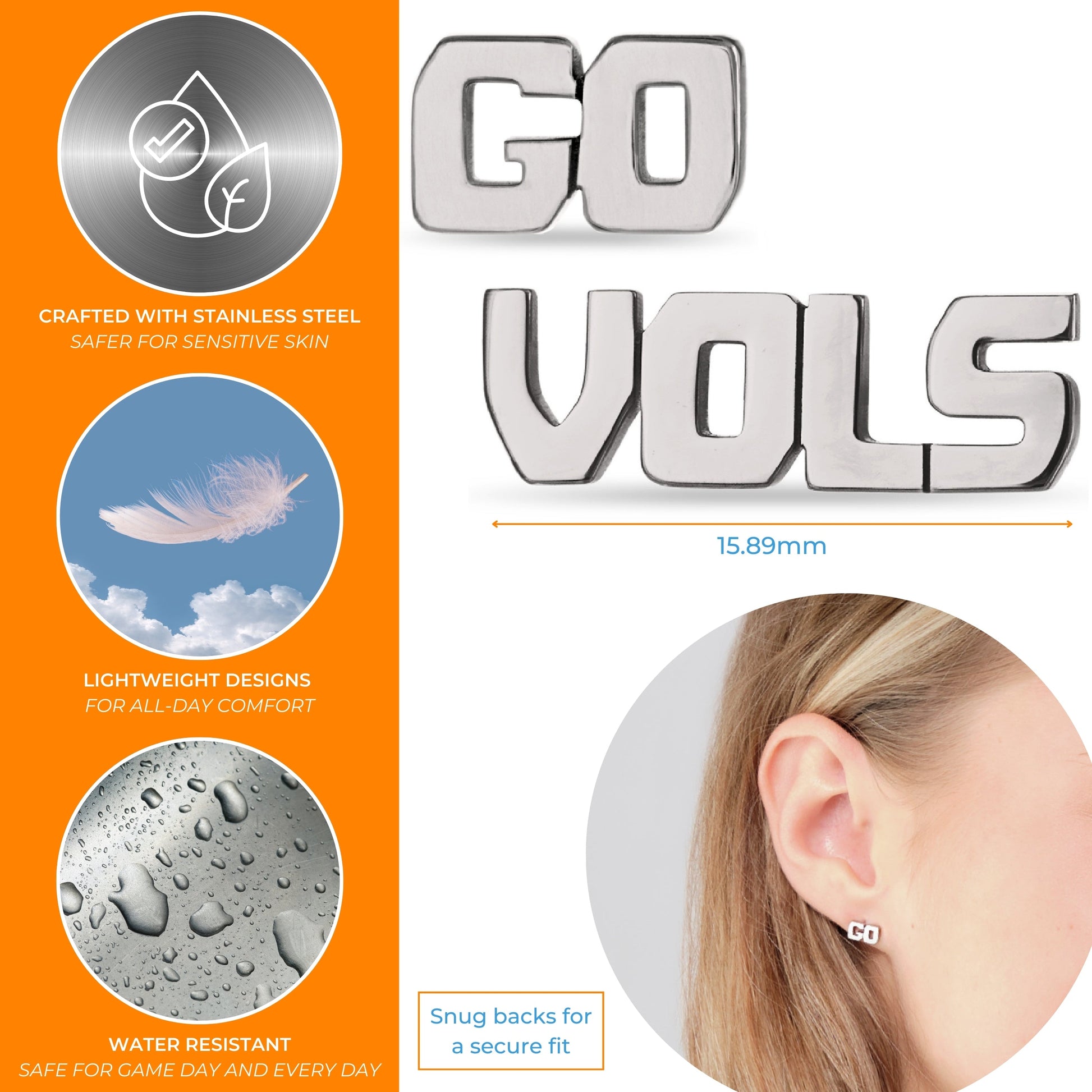 - Treasure Your Tennessee Vols Spirit - These Stone Armory University of Tennessee earrings are full of Volunteer pride! Featuring the cheer GO VOLS in stainless steel, these classic Tennessee stud earrings are just as unique as you. Go Vols!
