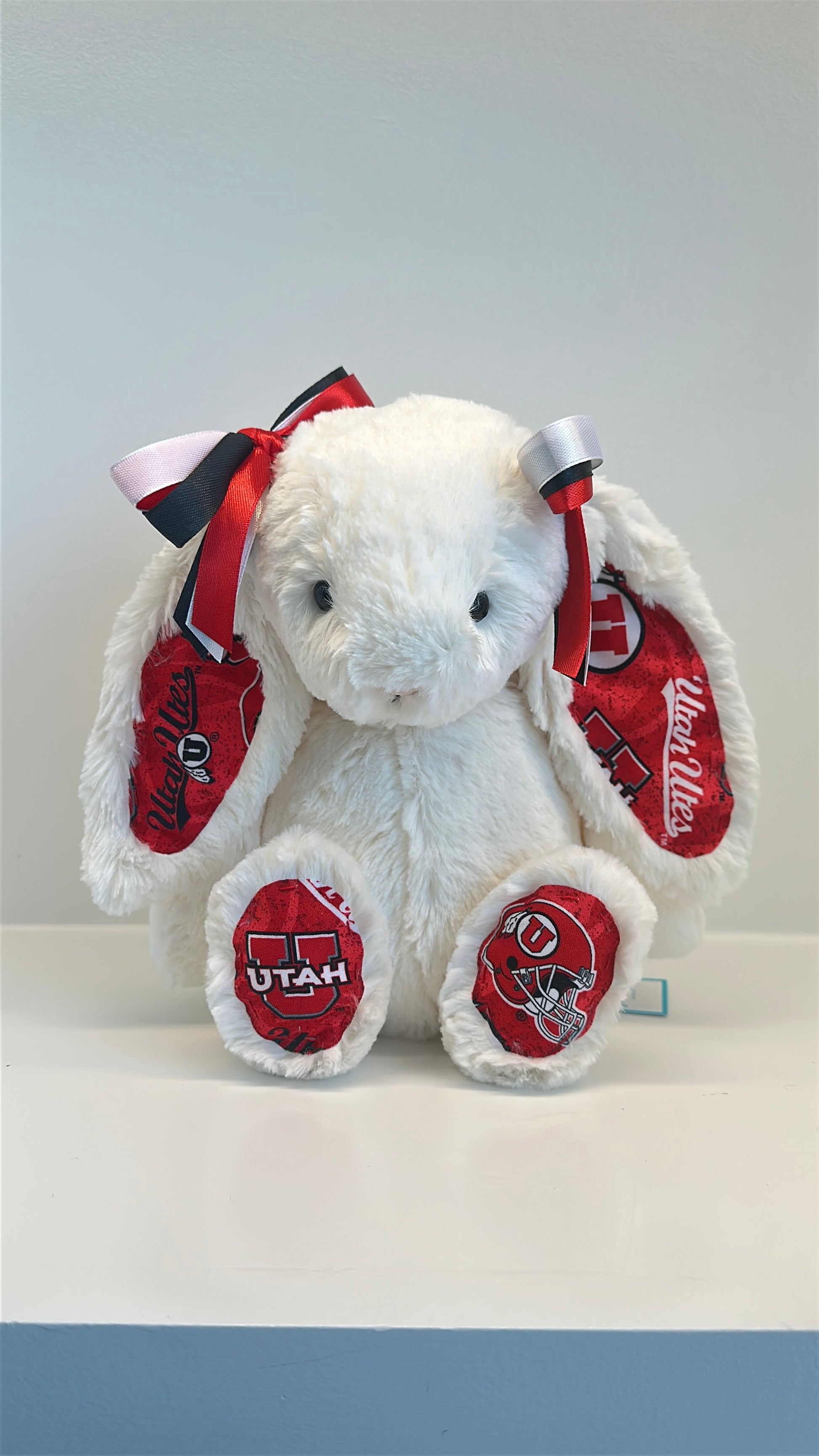 Snuggle up with this Custom College Jellycat Bashful Bunny. Each plush is adorned with licensed fabric for University of Utah, featuring coordinated ears, feet, and matching bows that bring your university’s colors and spirit to life. This adorable plush makes the perfect gift for newly accepted students, homesick college kids, devoted fans, alumni, and anyone who wants a cozy reminder of campus life.