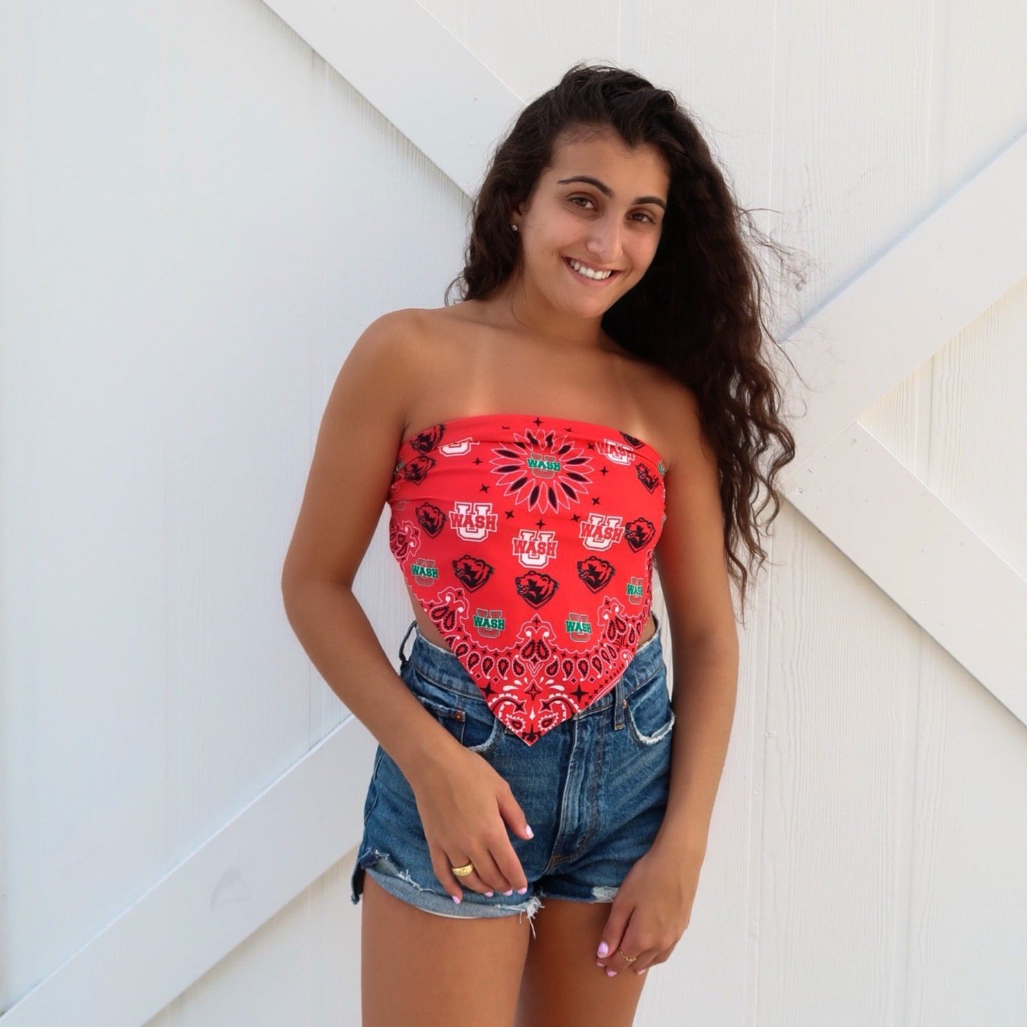 The must have top for all WashU Bears! Our super flattering WashU Bandana Top is the perfect top for all occasions. With double lining and and an adjustable tie back, this top provides side coverage and a second layer of lining to make this a perfect fit! Our top's soft and stretchy material will make you never want to take it off! Pair with your favorite pair of jeans or our WashU Game Day Skirt for the cutest outfit!