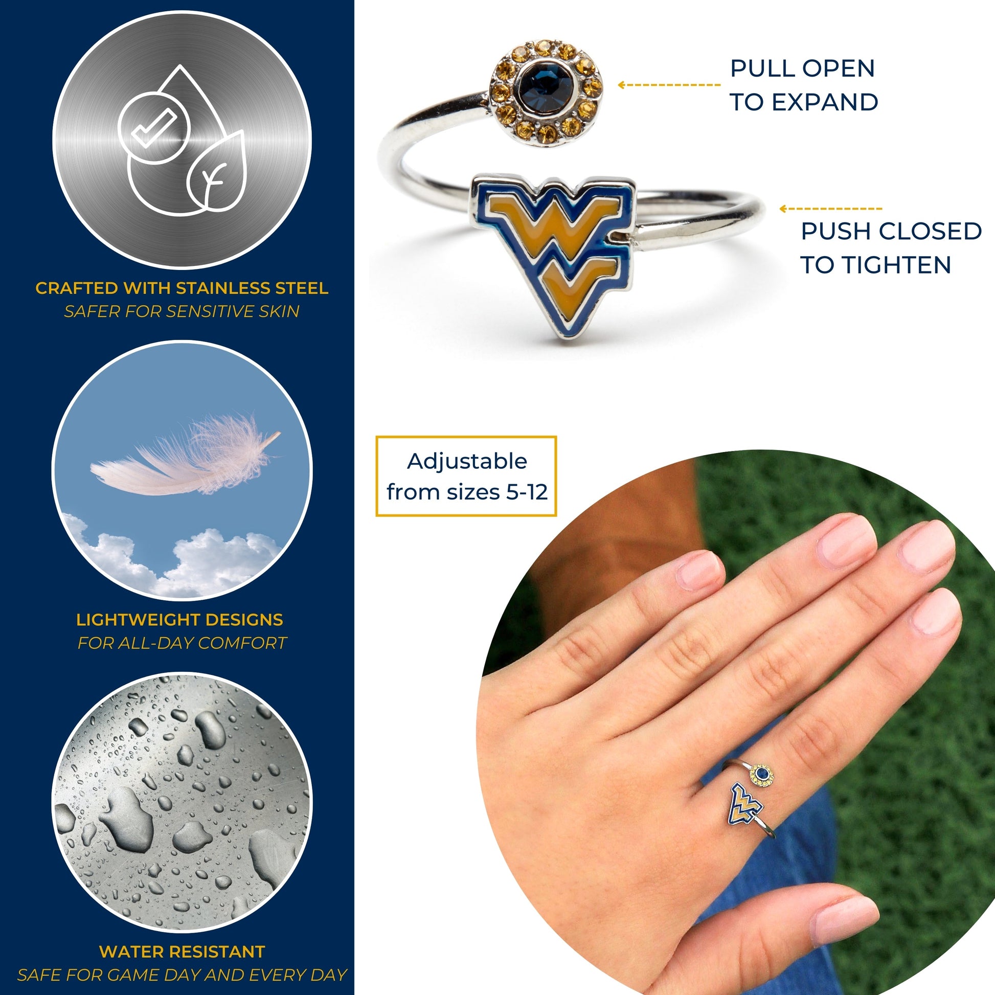 - 💙 THE PERFECT West Virginia University GIFT: This WVU Mountaineers ring is adjustable in size and will fit most, making it the perfect womens' gift for yourself, West Virginia fans, graduates, students, moms, sisters, daughters and West Virginia alumni. Great gift for Mother's Day, Christmas, birthdays and graduation.