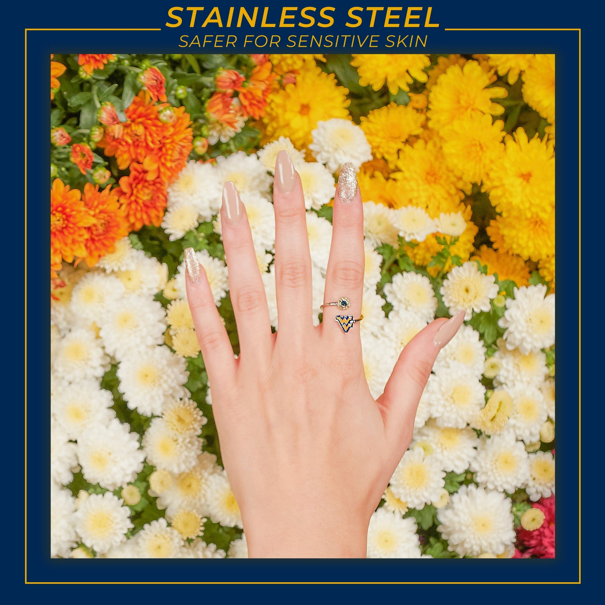 Stone Armory's West Virginia ring is finally here! Gear up for the game with our beautifully designed West Virginia Mountaineers ring! Wear it to the next tailgate or around town to show off your West Virginia University pride. This adjustable WVU ring would also make the perfect West Virginia gift for your favorite West Virginia Mountaineers fan! The West Virginia logo is accented by sparkling blue and gold crystals. Stone Armory's WVU jewelry is made of stainless steel and is adjustable in size, making this NCAA West Virginia ring the perfect gift to celebrate West Virginia graduation, birthdays, Mother's Day, first day of school, the first game, or for everyday fan wear. Thank you for supporting our small business!