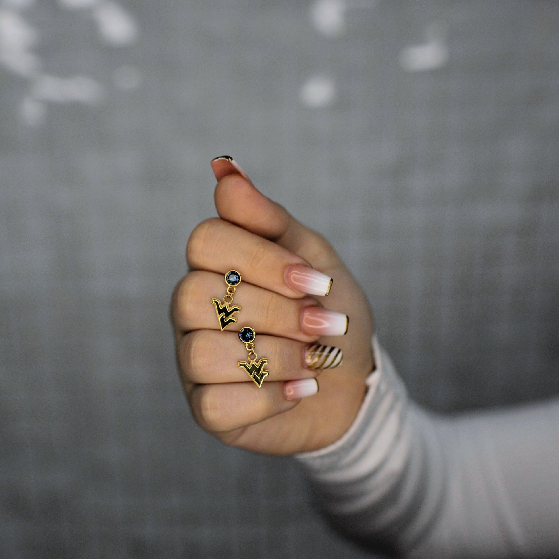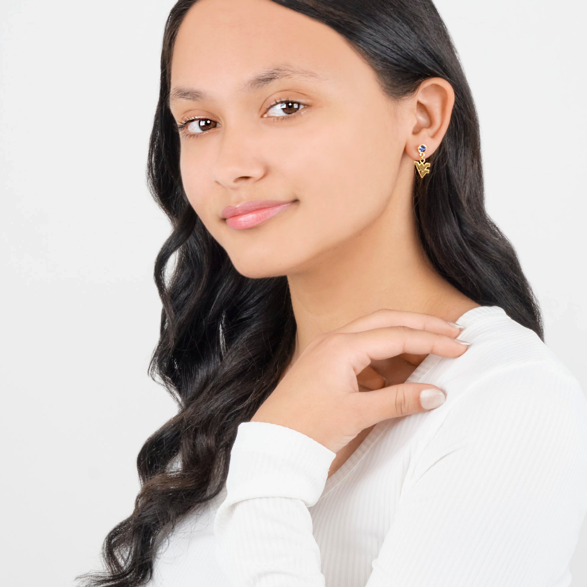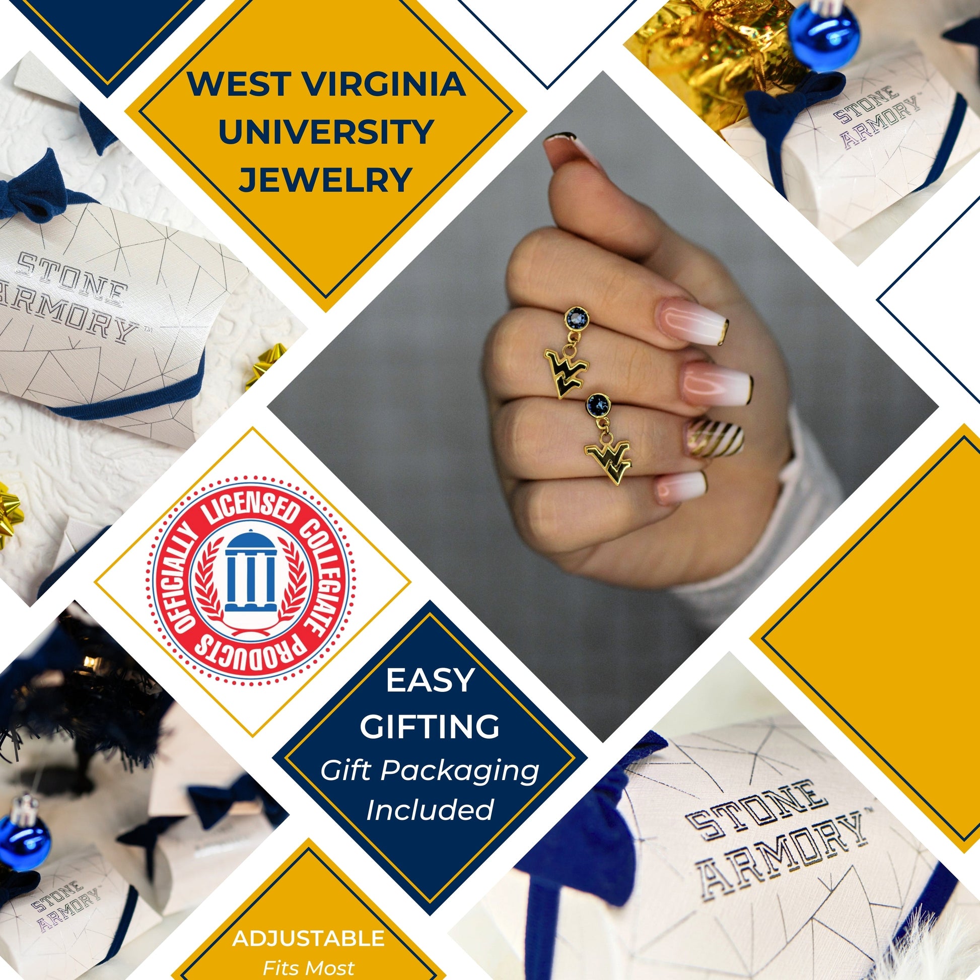 - Treasure Your West Virginia Mountaineer Spirit - These Stone Armory WVU gold plated earrings for women are full of Mountaineer pride! Featuring a gold plated Flying WV charm dangling from navy blue crystals, these classic dainty gold earrings are just as unique as you. Let's Go Mountaineers!