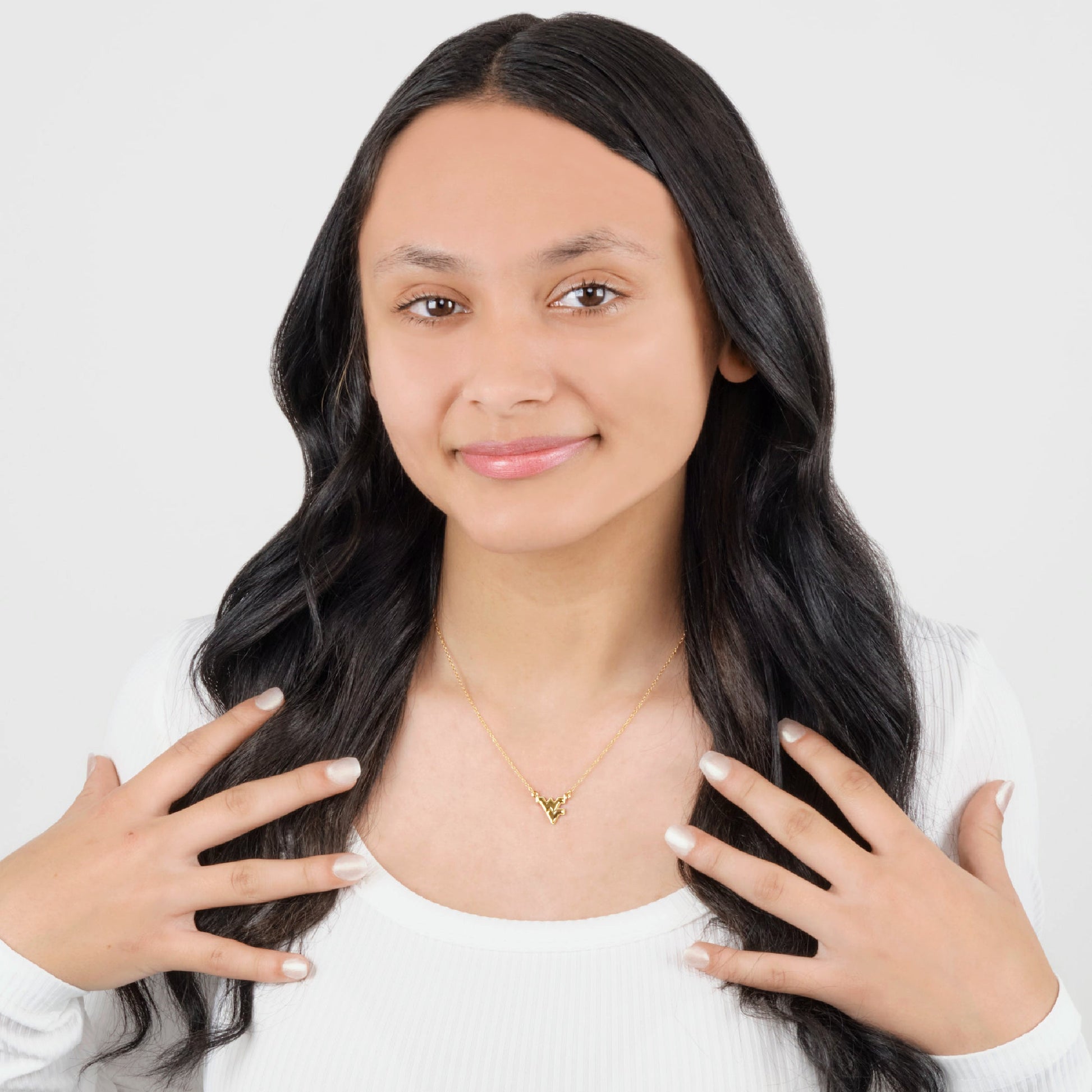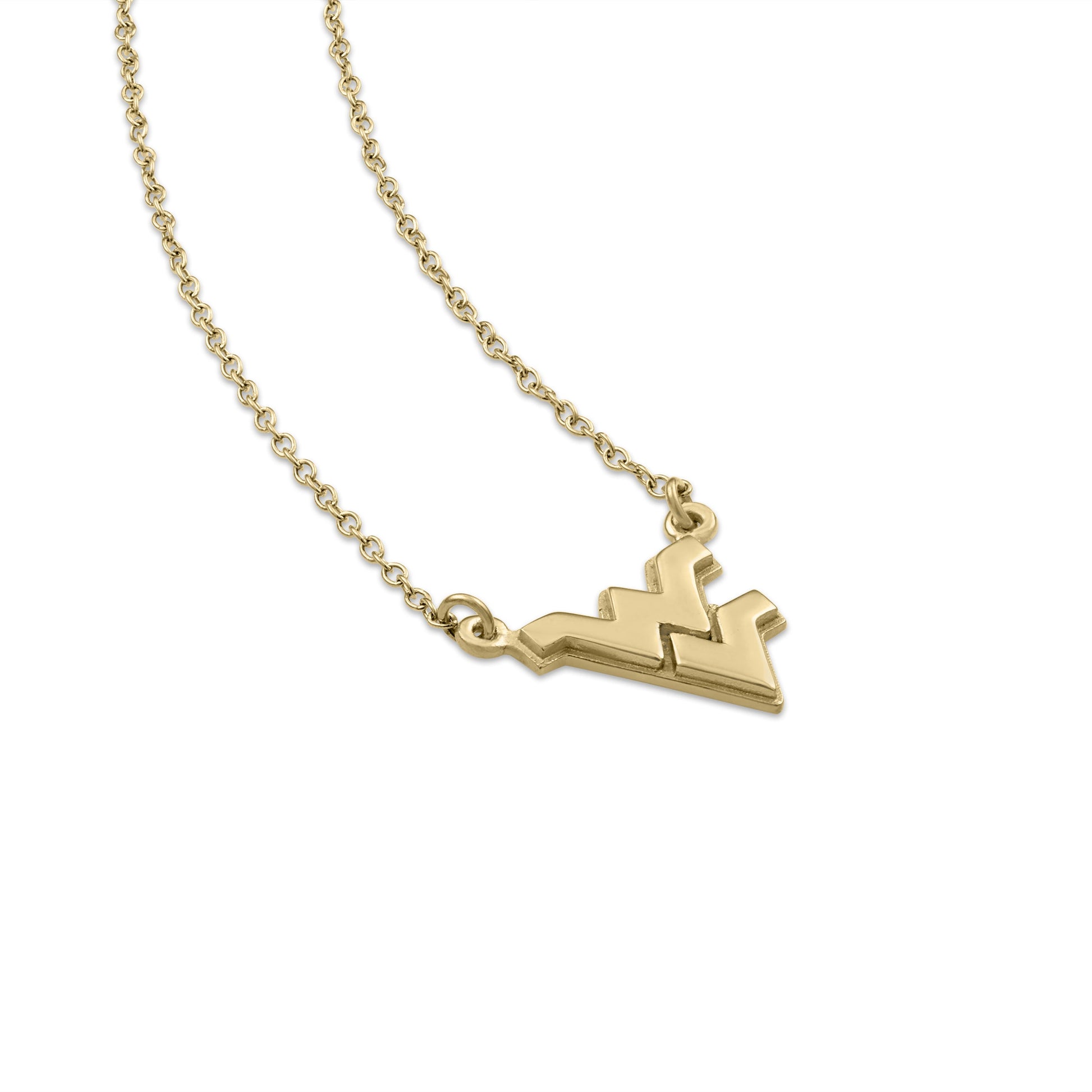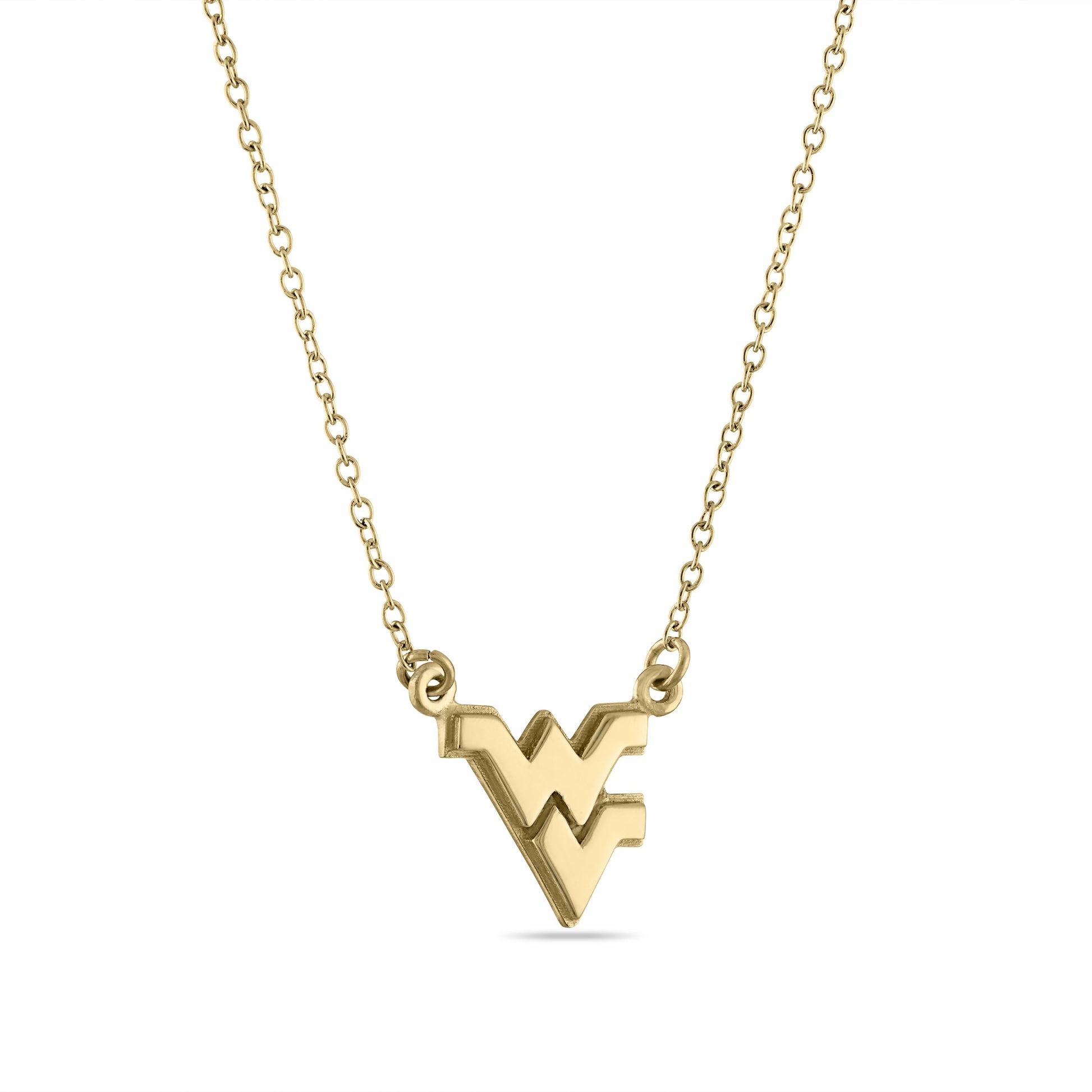 - Your Perfect Fit - This gold pendant necklace is adjustable from 16-20in and is always the perfect fit. Show off your beloved West Virginia football team and school with our gold dainty necklace! Wear it alone or as the matching necklace to our Flying WV gold studs or crystal drop earrings to create your own WVU gold jewelry set! The WV gold pendant measures 12.00mm wide x 12.00mm tall.