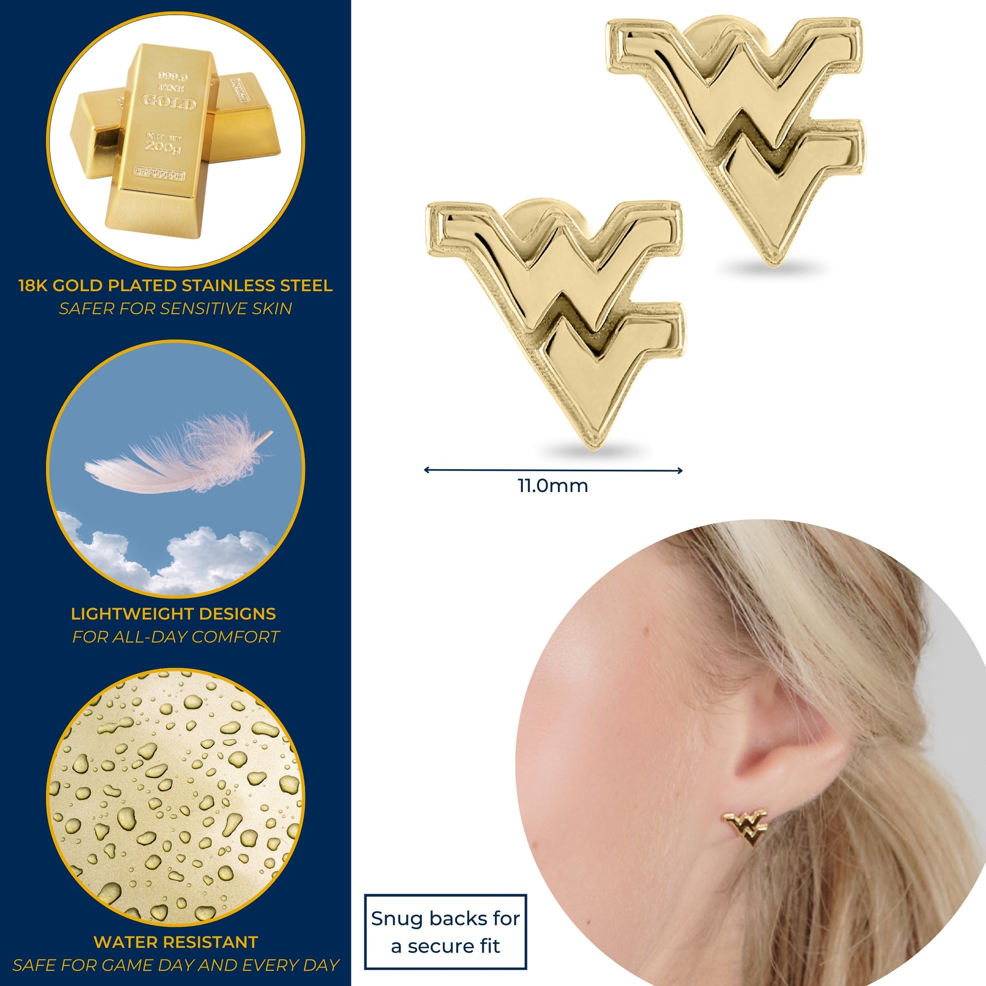 - Your Perfect Fit - These gold earrings for women are always the perfect fit. Show off your beloved WV football team and school with these statement earrings! Each lightweight Flying WV stud earring measures 11.00mm wide x 11.00mm tall.