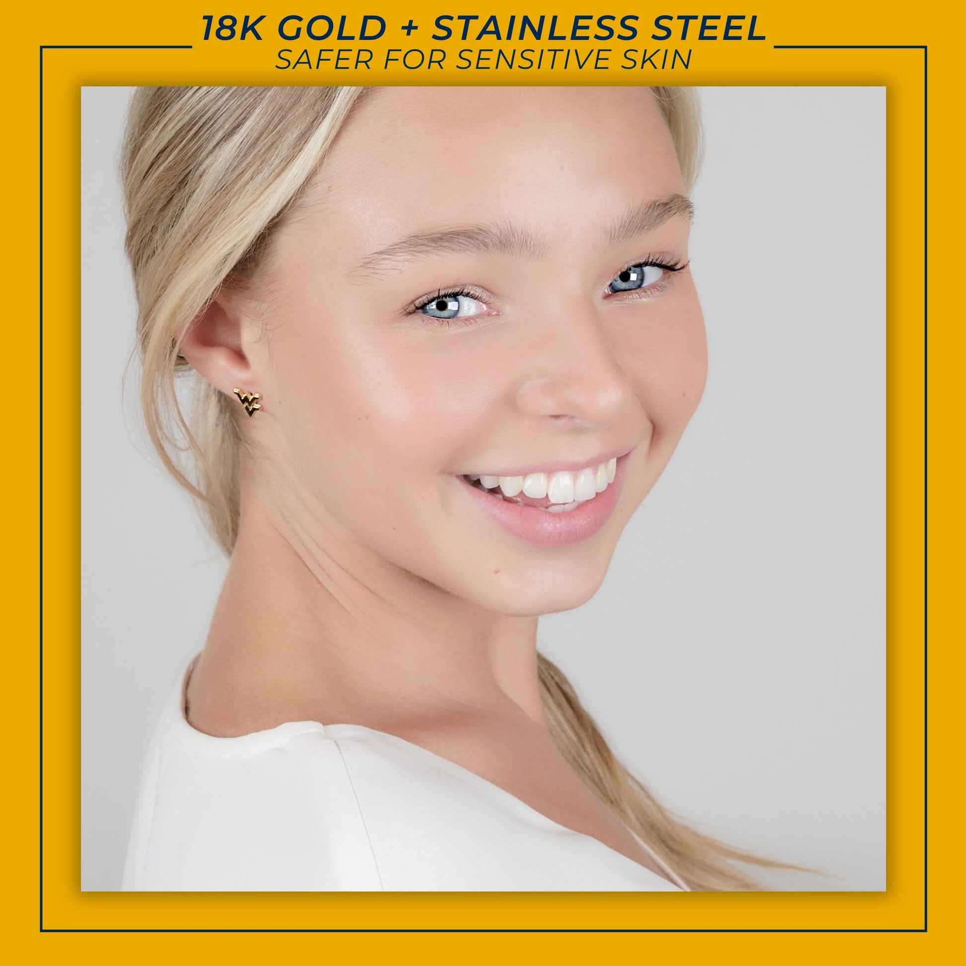 - The Perfect West Virginia Gifts -Beautifully packaged in a decorative jewelry box and ready to gift, these gold stud earrings are designed to last. Carefully crafted out of stainless steel and covered in 18K gold, these dainty earrings for women are the perfect college accessories for your best friend, your WVU grad, or yourself!